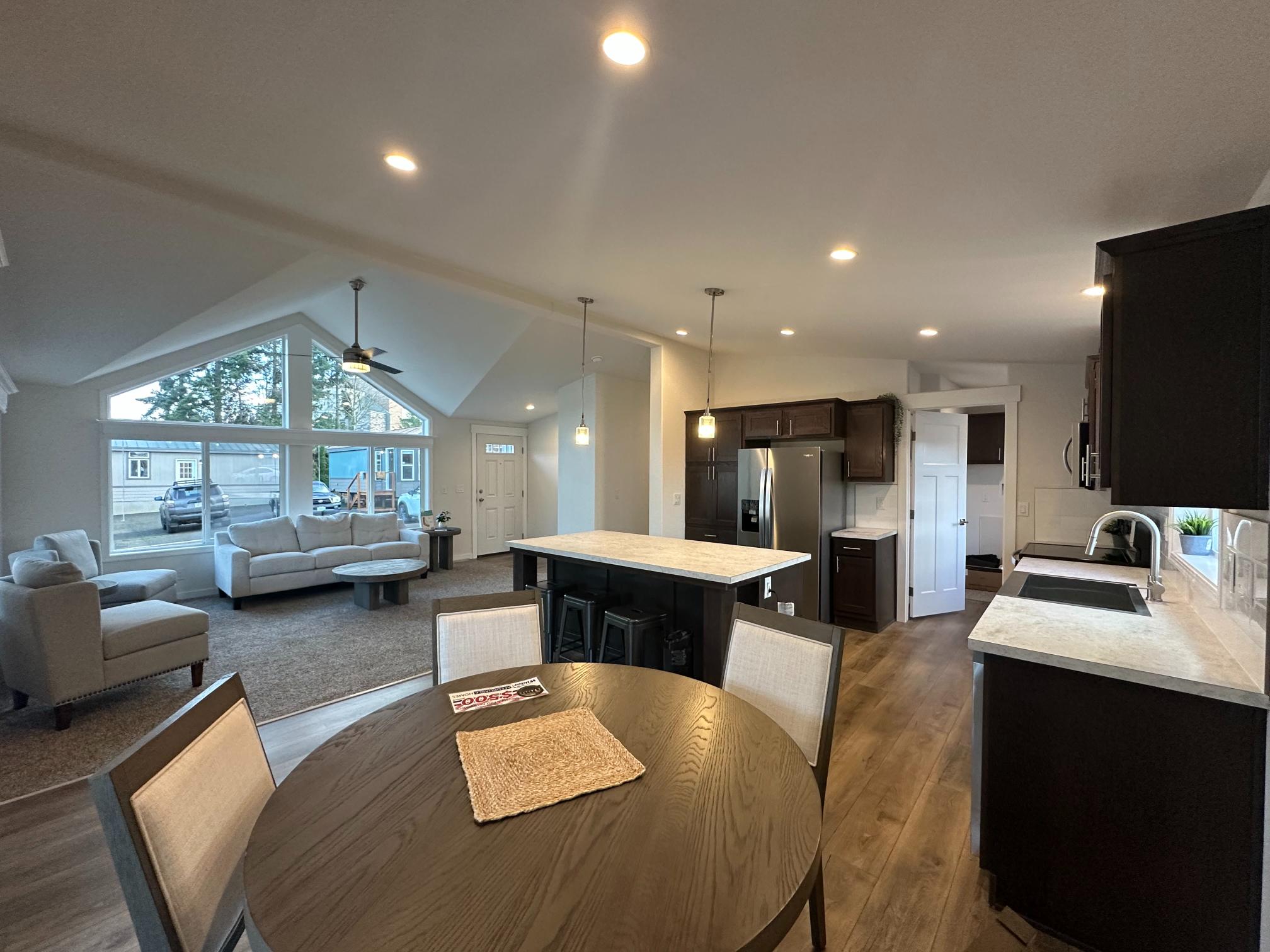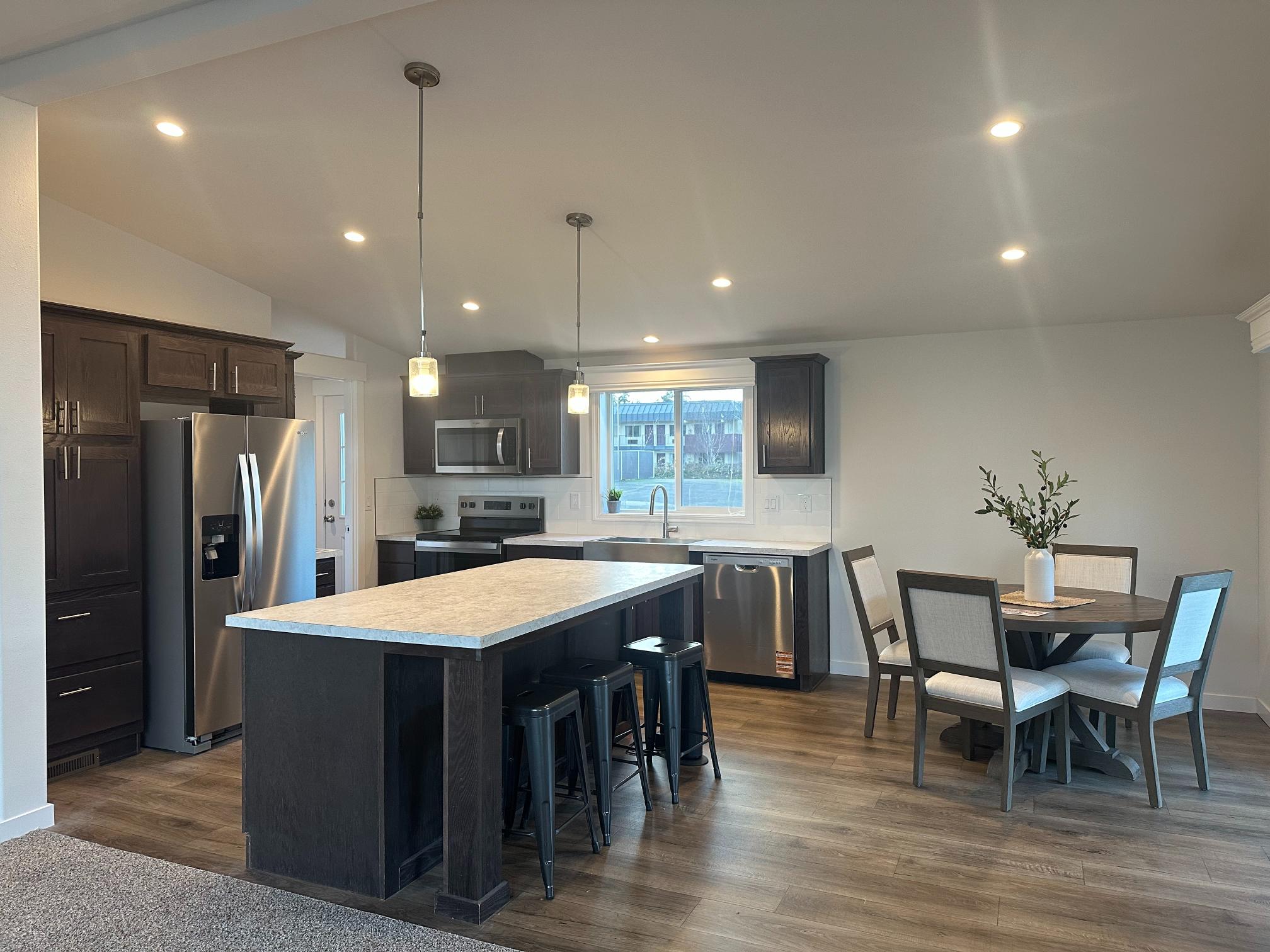 Kitchen Lighting: Recessed Lights in Kitchen Ceiling Above Islands / Chandelier in Dining Room