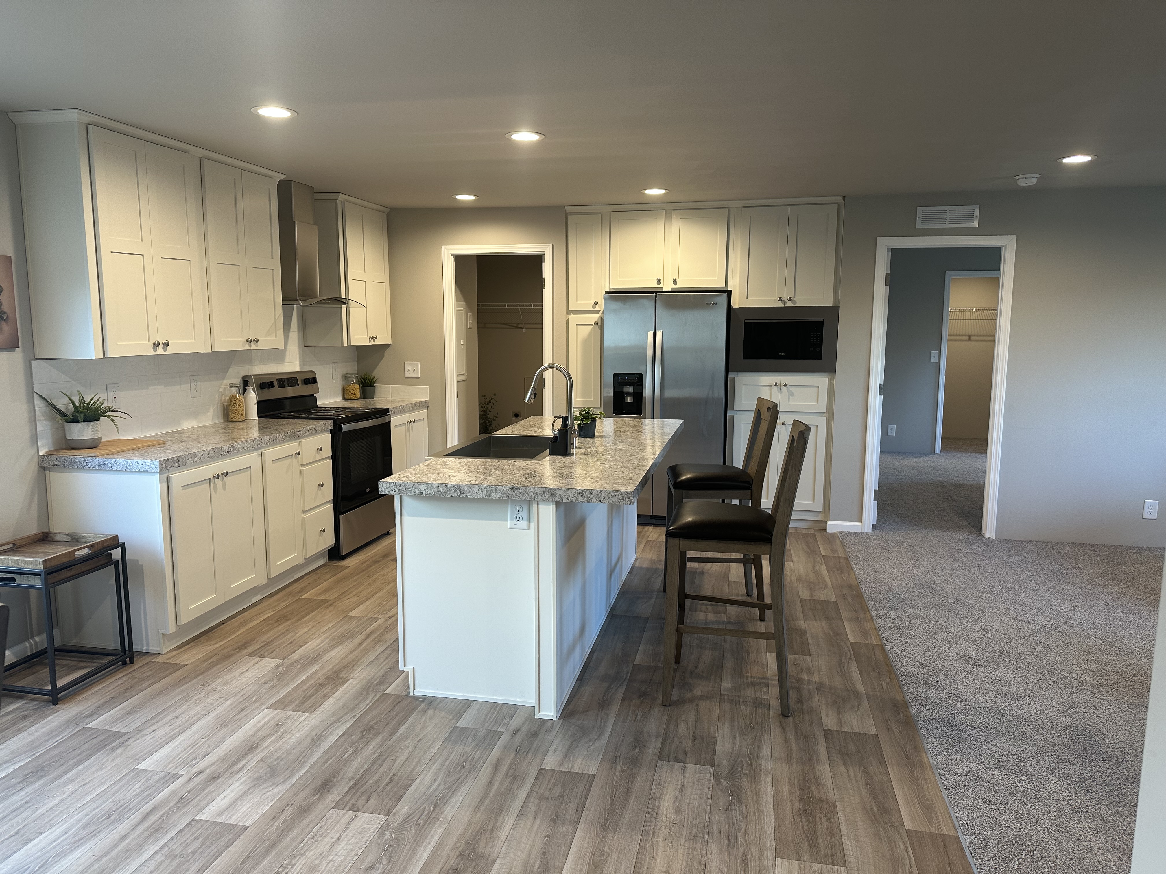 Kitchen Cabinetry: 30" overhead kitchen cabinets MDF face frame MDF cabinet doors / No cabinet door hardware / Unlined overhead cabinets w/single fixed shelf / Unlined base cabinets w/no center shelf